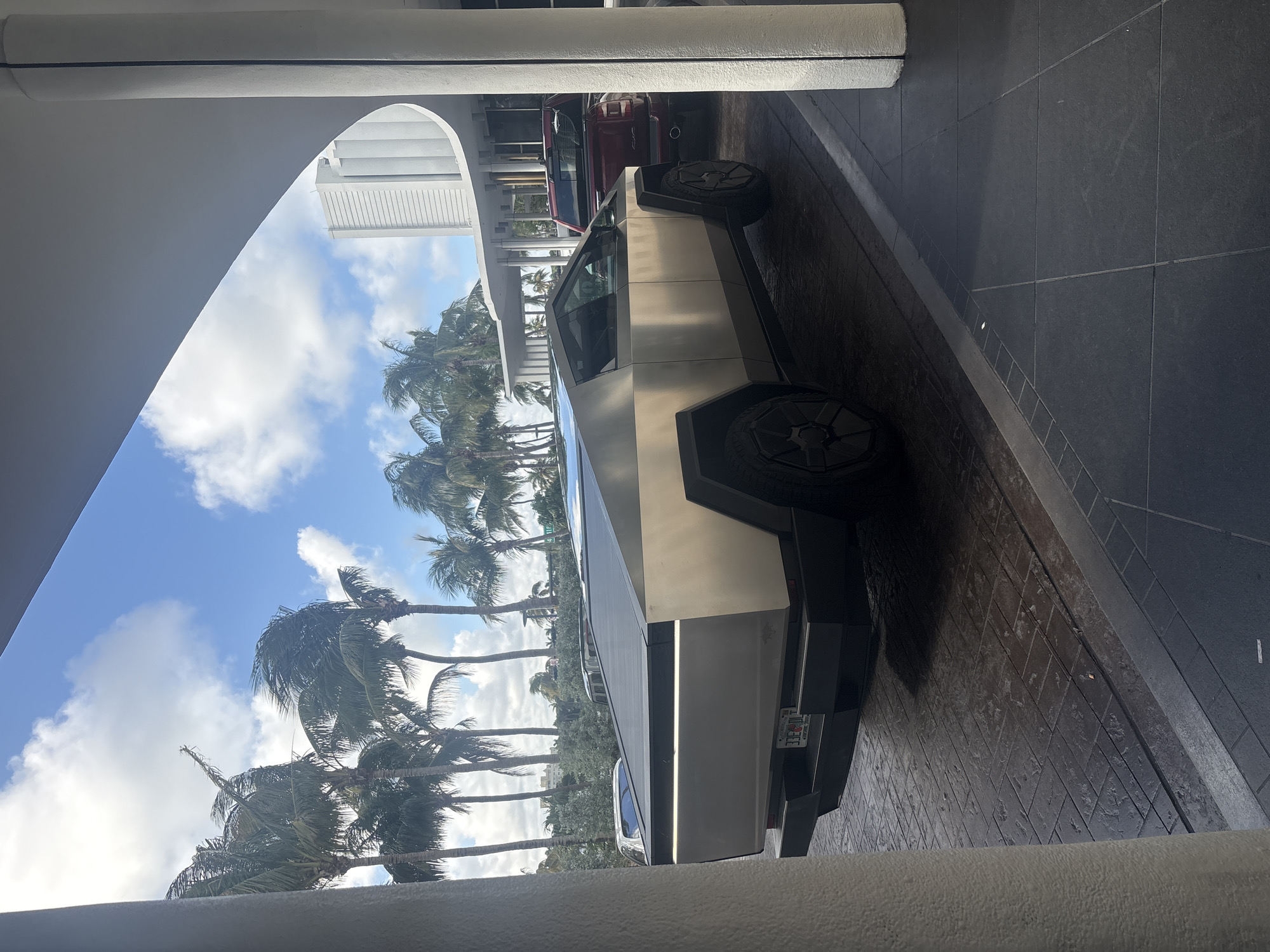 A silver Tesla Cybertruck parked under a white architectural overhang, possibly a building entrance. Palm trees and a blue sky with clouds are visible in the background. The truck is angled towards the right with the back visible. A red car is partially visible behind the Cybertruck. The floor is paved with rectangular stones.