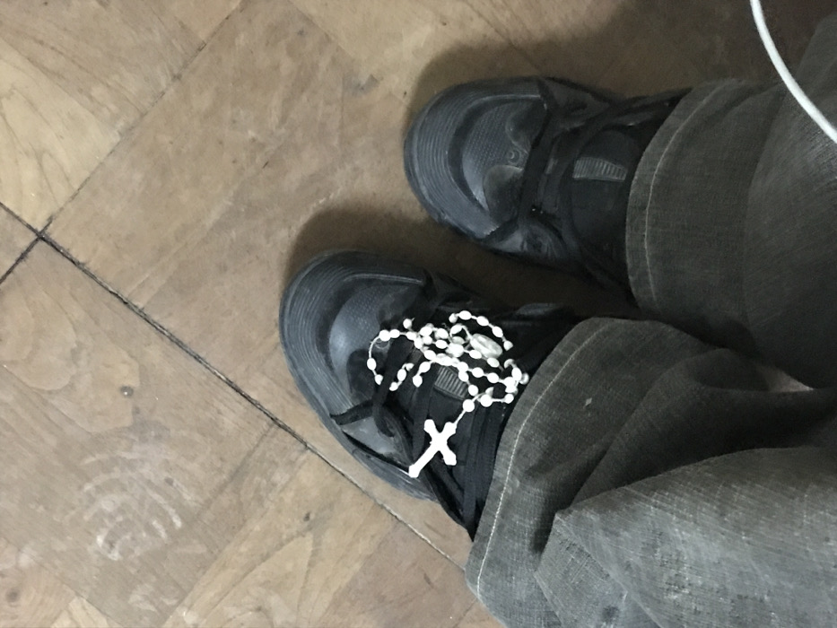 A view of two black shoes on a wood floor. Gray jeans cover part of the right shoe. A white rosary with a cross is draped over the laces of the left shoe. The shoes are dark and appear worn, while the floorboards are light brown and textured. The overall perspective is from above, looking down at the feet.