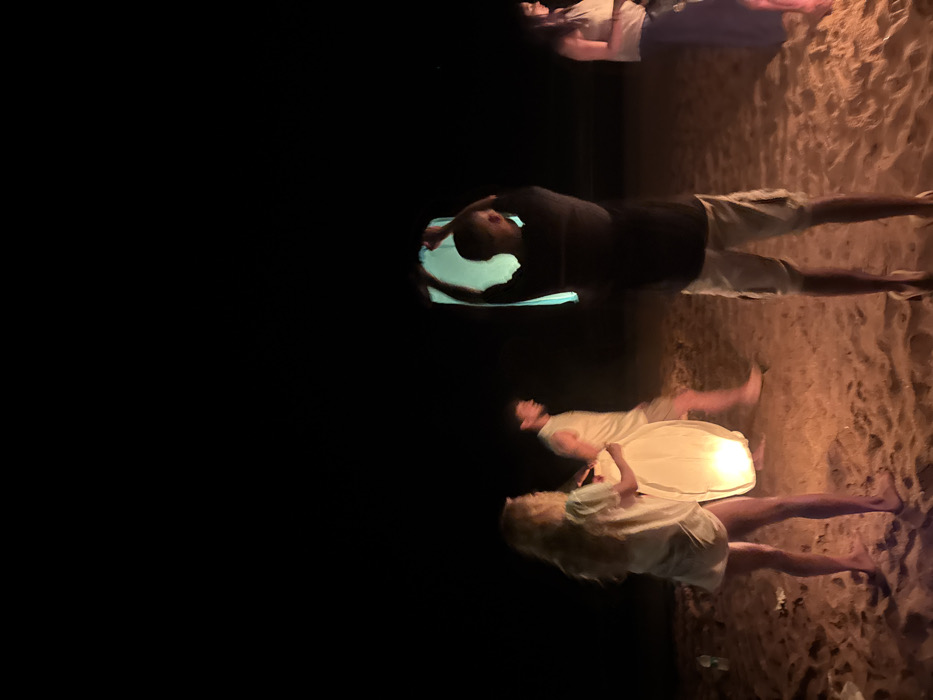 Four individuals stand on a sandy beach at night. The scene is dimly lit. One person holds a square, glowing light source. A second person, positioned above, looks into a similar light. Two others are seen in the background. The dark expanse contrasts with the sandy ground under their feet. The people seem to be enjoying a night on the beach with artificial lights.