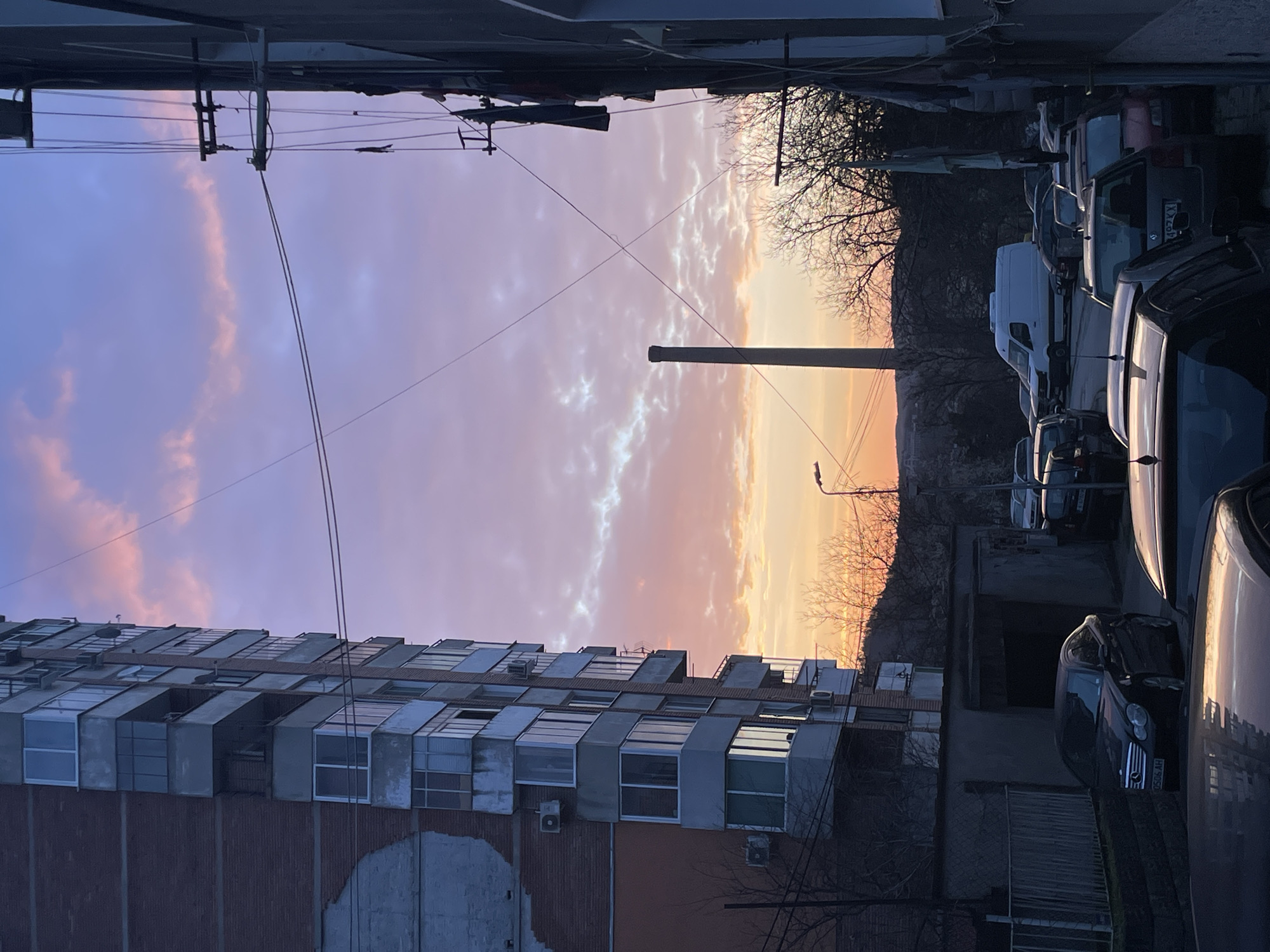 The image depicts an urban street scene in Veliko Tarnovo, Bulgaria, at dusk or sunset. The sky, occupying the upper two-thirds of the frame, displays vibrant hues of purple, pink, and orange, with scattered clouds illuminated by the setting sun. On the left, a tall, multi-story residential building dominates the foreground, constructed of brick and concrete with visible signs of wear and peeling plaster on its lower sections. Multiple enclosed and open balconies are visible, along with several external air conditioning units attached to the facade. Bare tree branches are visible at the base of this building. On the right, a darker building wall is partially visible, from which multiple utility wires extend horizontally and diagonally across the frame, converging near the center. A clothesline with dark garments hanging to dry is attached to this right-side structure. The middle ground features a street or parking area densely populated with numerous parked vehicles, including sedans, hatchbacks, and a white van further down the road. Some car roofs reflect the sunset colors. A street lamp pole with a light fixture is present among the parked cars. In the mid-to-far distance, a tall, slender, dark industrial chimney (smokestack) stands vertically against the brightly colored horizon. Beyond the vehicles and the chimney, silhouetted hills covered with bare trees and vegetation are visible under the twilight sky. No individuals are discernible within the scene.