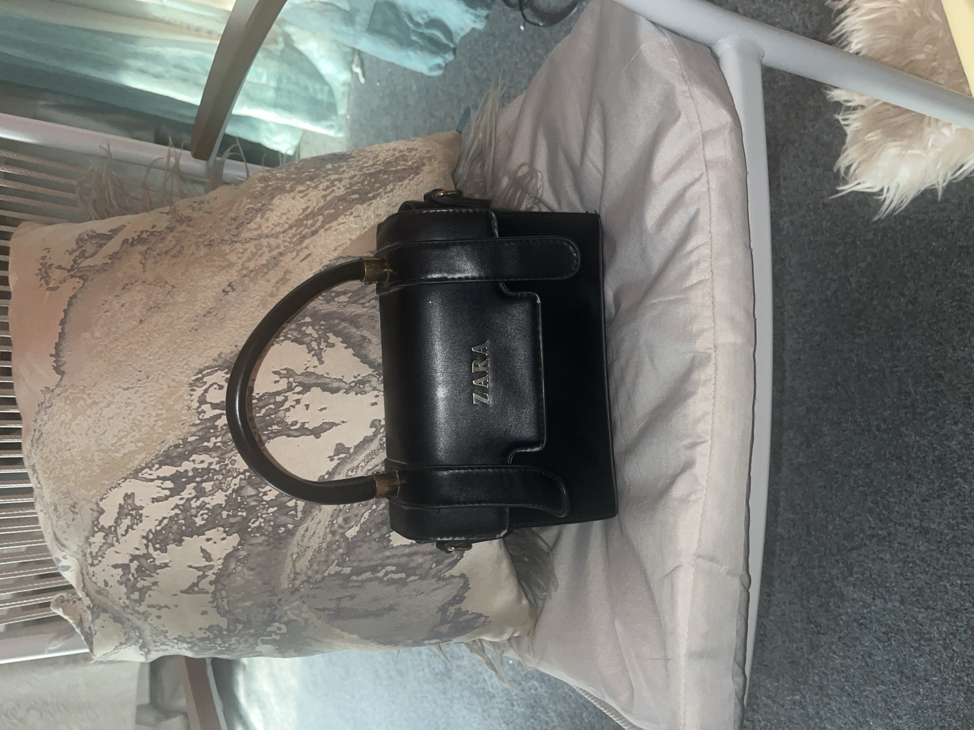 A black Zara handbag is on a chair with patterned cushions