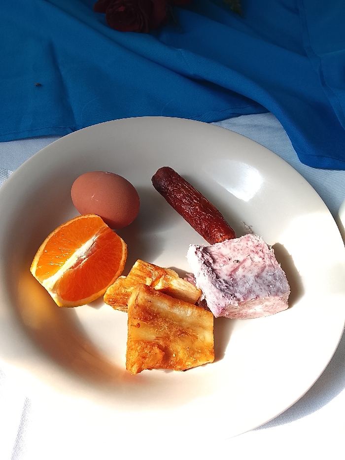 A white plate holds a collection of diverse foods. There's a brown egg, an orange segment, a sausage, and a light purple cube, likely a marshmallow. Also on the plate are a few small fried square slices, appearing crispy and golden-brown. The plate rests on a white surface with a blue cloth and red flowers in the background. The lighting is bright, casting shadows on the plate's surface.