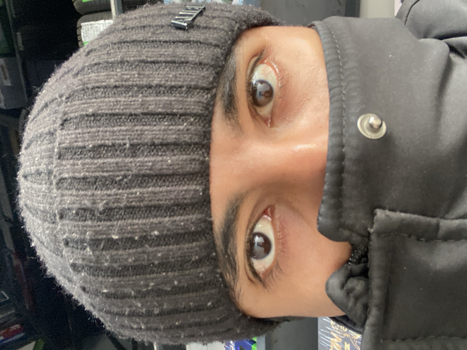 The image displays a close-up portrait of an individual, stated to be located in Bukhara, Uzbekistan. The subject's face is partially obscured by winter attire. Dark brown eyes, with visible whites and constricted pupils, are directed straight into the camera. The skin around the eyes exhibits a medium tone. Dark eyebrows are present above the eyes. The individual wears a dark grey ribbed knit beanie, covering the forehead and the top of the head. The beanie's surface shows numerous light-colored fibers or lint. A small, metallic, rectangular emblem, featuring an illegible inscription that resembles "ALIEN," is attached to the beanie on the viewer's left side. A black, presumably padded or insulated jacket, is worn with its collar zipped up, obscuring the subject's mouth and nose. A silver-colored snap button is visible on the viewer's left side of the jacket's collar, and a zipper track is visible on the viewer's right side. The background is out of focus. On the viewer's right, blurred shapes include a blue or green element. On the viewer's left, indistinct vertical elements, potentially shelving, are visible, along with what appears to be a tire featuring white text. Reflections within the subject's pupils indicate a rectangular light source.