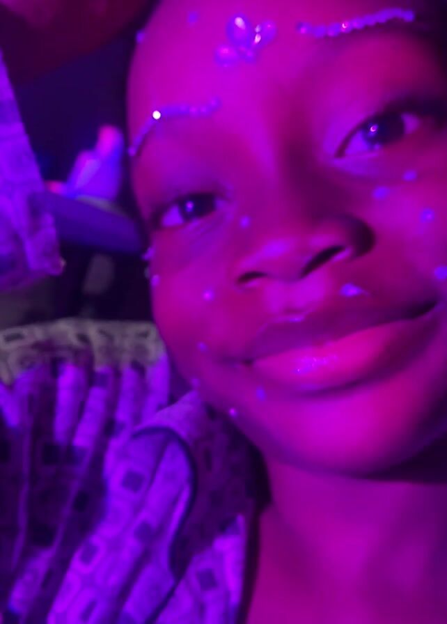 close-up face of a child with dark skin under a strong purple light. The child has decorations on their forehead, eyebrows, nose, and cheeks. The decorations appear to be small jewels or beads. The child is wearing what looks like a patterned pajama top or shirt. Their expression is a slight smile. A hand briefly enters the frame near the top of the head at the beginning of the video.