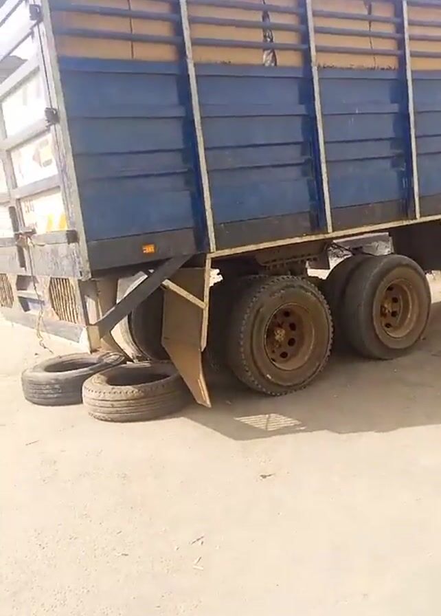 large truck parked on a paved surface. The truck has a blue and yellow cargo area with a wooden frame. Three spare tires are lying on the ground near the rear wheels of the truck. The wheels appear to be old and dusty. The surrounding environment looks like a dusty industrial or roadside area. People are walking in the background.
