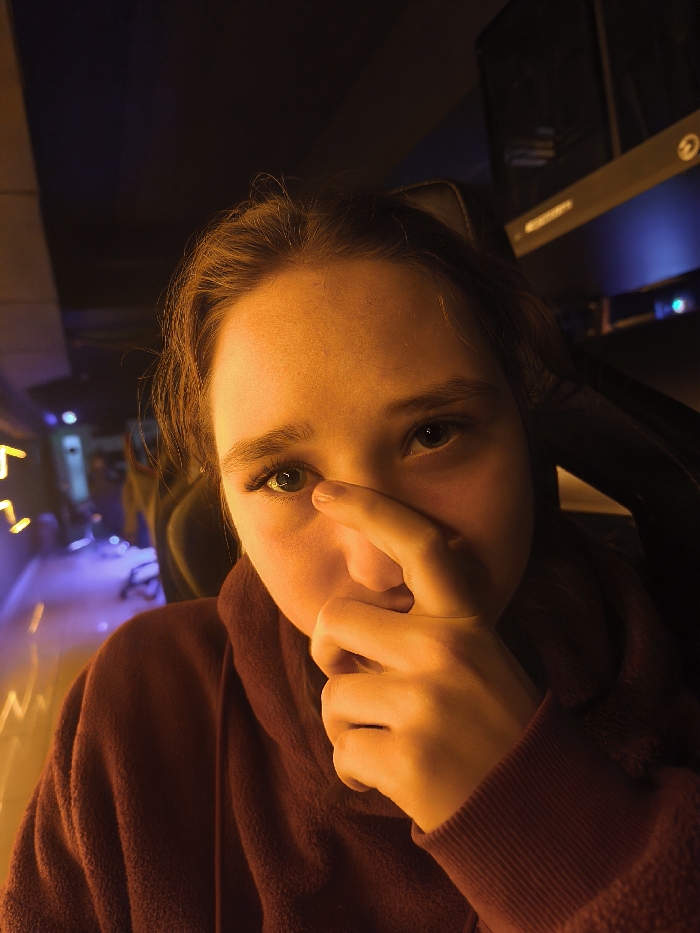A young adult female is depicted in a close-up, head-and-shoulders portrait within an indoor establishment in Tashkent, Uzbekistan. The subject's face is illuminated by a prominent warm, orange-yellow light source originating from the left, casting shadows that define her facial features and partially obscuring her left hand. Her hair is dark and styled back from her forehead. Her eyes are dark and directed towards the viewer. The subject's right index finger is positioned against the bridge of her nose, near the inner corner of her left eye. She is wearing a dark red, likely fleece, hooded sweatshirt with a visible ribbed cuff on her right wrist. The background is dimly lit and significantly out of focus, featuring bright, linear yellow neon or LED lighting elements on the left. Further into the background, diffuse purple and blue ambient lighting is visible, suggestive of illuminated electronics or decorative fixtures. On the upper right quadrant of the background, a dark, angular structure, possibly part of a shelving unit or a monitor frame, is discernible, with a faint blue glow emanating from its lower edge. The overall environment is consistent with a modern entertainment venue, such as a gaming establishment or a casual social club.