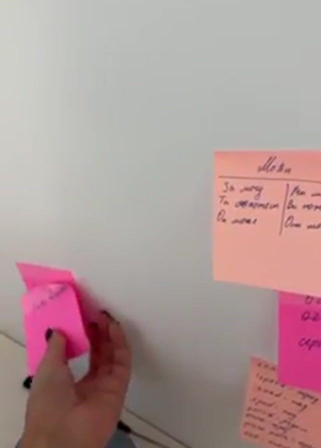 A hand with dark fingernails places several pink sticky notes on a white wall. There are already some other colored sticky notes on the wall. Some have writing on them.