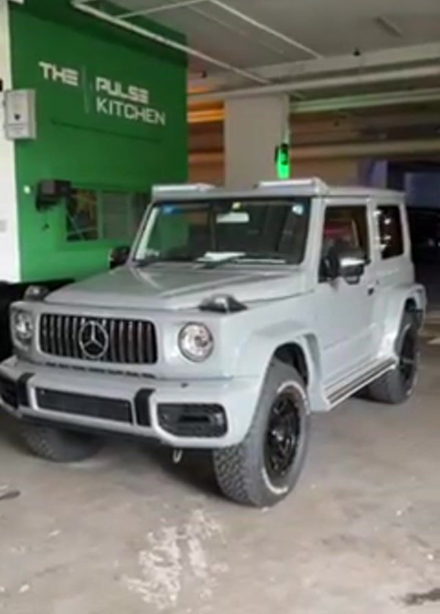 gray modified Suzuki Jimny with a Mercedes-Benz grille and other aftermarket customizations. It is parked in a garage or indoor parking area next to a black classic convertible car. There is a green wall with the words "THE PULSE KITCHEN" in white letters. There is also a white van visible in the background. The floor appears to be concrete. The lighting is a mix of natural light from outside and overhead fluorescent lights.