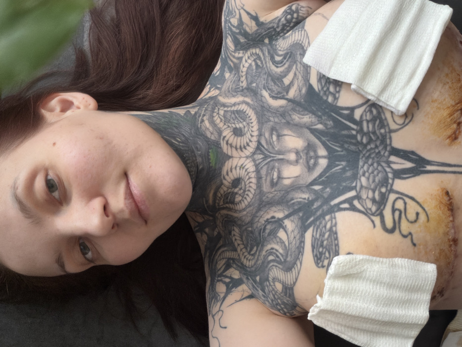 A woman with long brown hair is lying down. She has fair skin and is looking at the camera. Her upper chest and neck are covered in a large, detailed tattoo of Medusa with snakes. There are two white gauze pads on her chest covering areas with healing wounds. The background is a dark grey/green color.