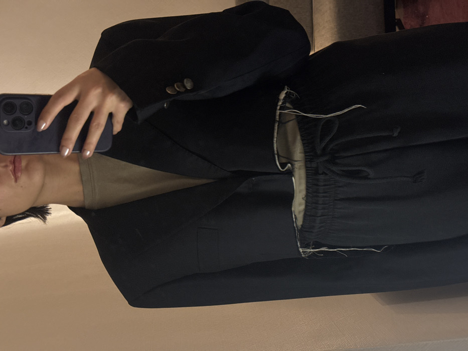 A person in a mirror selfie wears a black blazer, revealing a tan T-shirt underneath. Black drawstring pants with an elastic waistband are also visible. The person is holding a smartphone, obscuring part of their face. The background shows a plain, light-colored wall. The blazer has visible buttons on the sleeve. The pants feature a string tie.