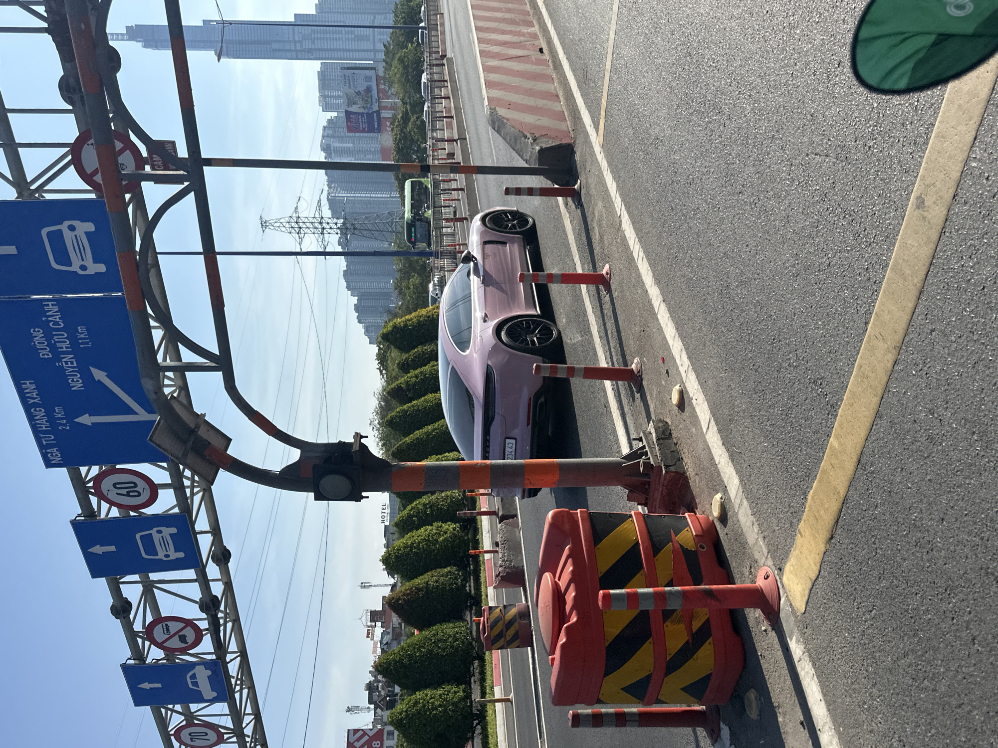 The image depicts a multi-lane urban road in Ho Chi Minh City, Vietnam, situated within or immediately adjacent to Thủ Đức City. The perspective faces generally northwest towards the central business district skyline, prominently featuring Landmark 81. In the mid-ground, a light pink Porsche Panamera (license plate partially visible as "234.43") is stopped in what appears to be a main traffic lane. The vehicle has black multi-spoke wheels. To the right of the Porsche is a grey traffic light pole striped with orange and grey, featuring a dark, unlit signal head. Orange traffic bollards and red-and-white striped concrete barriers delineate road sections. In the immediate foreground to the left, a large red and black/yellow striped plastic barrier stands beside several orange traffic bollards. The road surface is asphalt with yellow and white painted lines. Overhead, a metal gantry supports multiple blue road signs with white text and symbols. These include directional arrows, speed limits (circular red signs indicating "70" and "60" km/h), a "cars only" symbol, and a "no motorcycles or bicycles" prohibition sign. Text on the signs in Vietnamese indicates "NGÃ TƯ HÀNG XANH 2.4 Km" (Hàng Xanh Intersection 2.4 km) and "ĐƯƠNG NGUYỄN HỮU CẢNH 1.1 Km" (Nguyễn Hữu Cảnh Street 1.1 km). The background features a dense urban landscape of high-rise buildings. A tall electricity pylon and power lines are visible. A large green bus travels in the distance on an elevated roadway. A line of uniformly trimmed, conical evergreen trees runs along a median strip. The sky is clear and blue, and bright sunlight casts distinct shadows, suggesting a mid-morning or early afternoon setting. A partial view of a dark green object is present in the lower right corner. No individuals are explicitly visible.