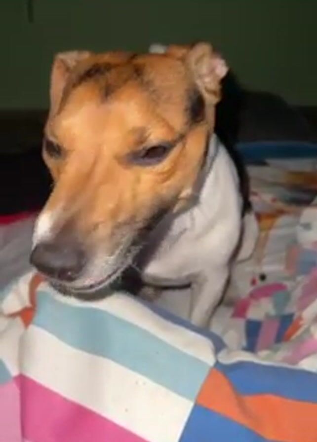 A brown and white Jack Russell Terrier is sitting on a bed