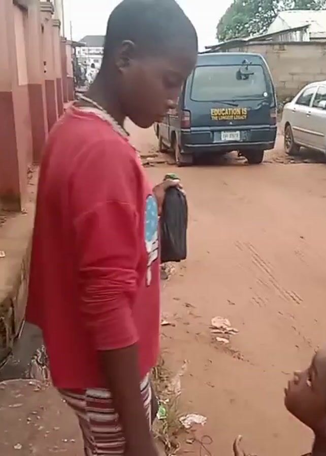 two children standing on the side of a muddy road. One child is wearing a red long-sleeved shirt and a striped skirt. The other child is wearing a black shirt. Behind them, a van with the words "EDUCATION IS THE LONGEST LEGACY" is parked on the road. In the background, a military vehicle is also visible. A drainage ditch runs along the side of the road. The child in the red shirt appears to be holding a black bag. The camera follows the child in the red shirt as they walk away from the camera.