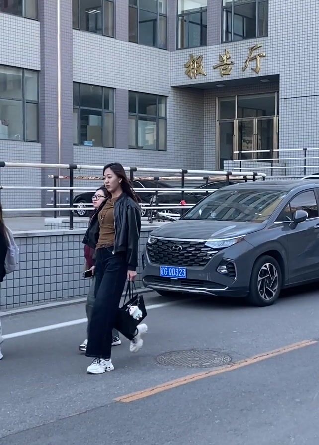 group of pedestrians walking along a street in front of a building. The building is a light gray color with windows and a sign in Chinese. A gray SUV is parked on the side of the road. Several pedestrians walk along the street, and then a group of people approach from the background.