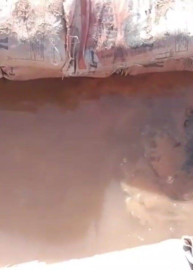 A person is using a shovel to move mud and debris from a shallow, brown-water filled ditch. The ditch is lined with bags of material. The person is standing and working from the side of the ditch, balanced on something cushioned.