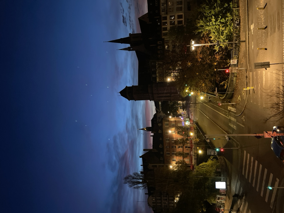 An upward-facing view captures an urban landscape at dusk. Dominating the left is a deep blue sky with wisps of pink clouds, set against silhouetted spires and buildings. To the right, a street is lit by streetlights, casting light onto buildings and trees. A bridge crosses the street, with visible pedestrian crossings. Traffic lights glow red and green, signaling activity in the twilight.