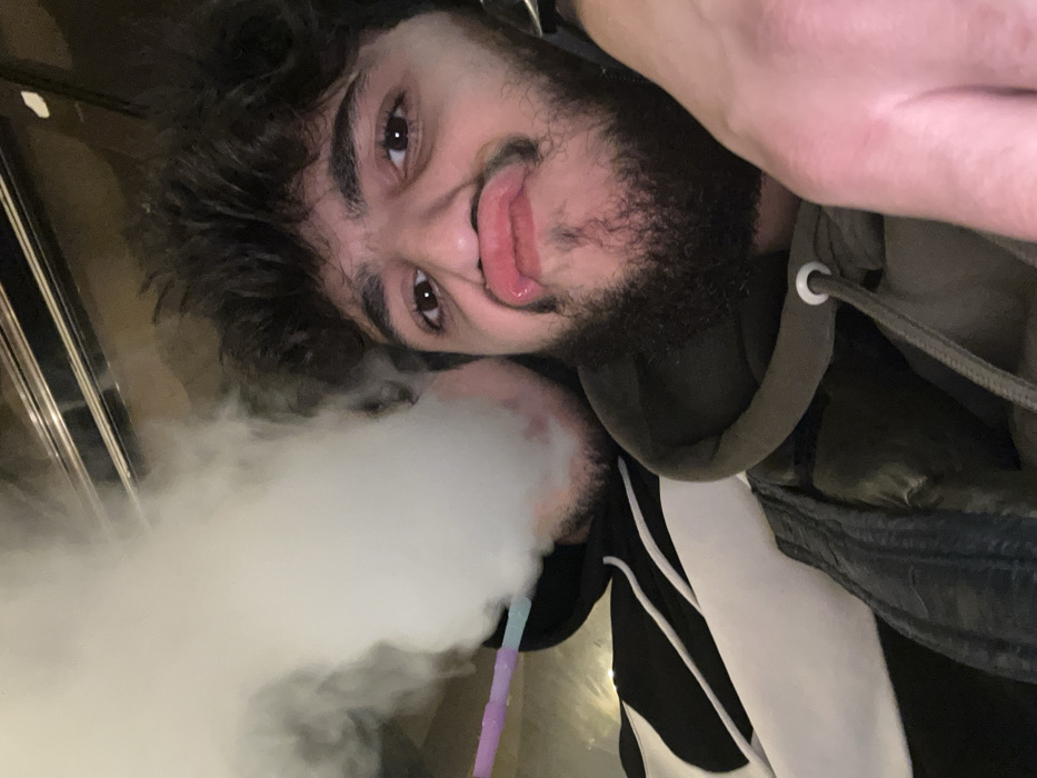 A selfie of a man with dark, curly hair, a beard, and brown eyes. He is sticking his tongue out slightly and looking directly at the camera. He appears to be smoking a hookah, as there is a large cloud of smoke in front of his face. He is wearing a hoodie and a black and white jacket. The background is dark and indistinct, though it seems he is inside.