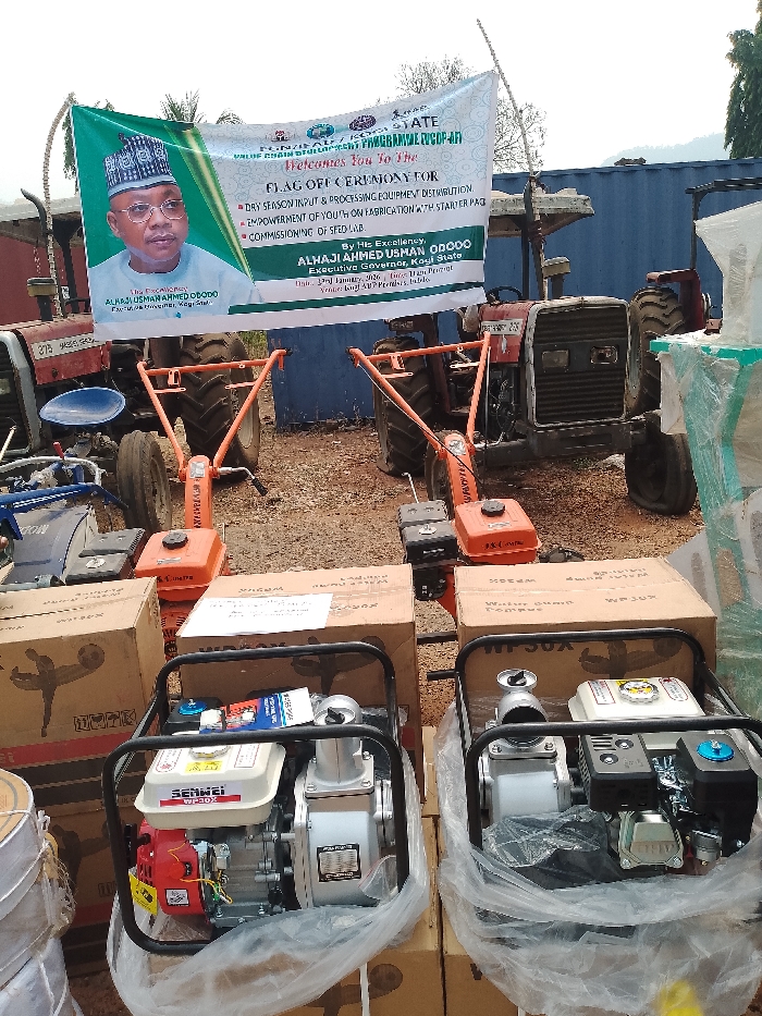 An outdoor scene in Lokoja, Kogi State, Nigeria, depicts an agricultural equipment distribution event at the KADP Premises on January 2nd, 2020