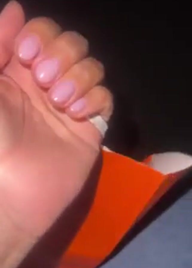 A close-up shot shows a hand holding an orange and white bag and a white face mask. The hand has light pink nail polish. The person appears to be wearing denim pants. The background is dark.
