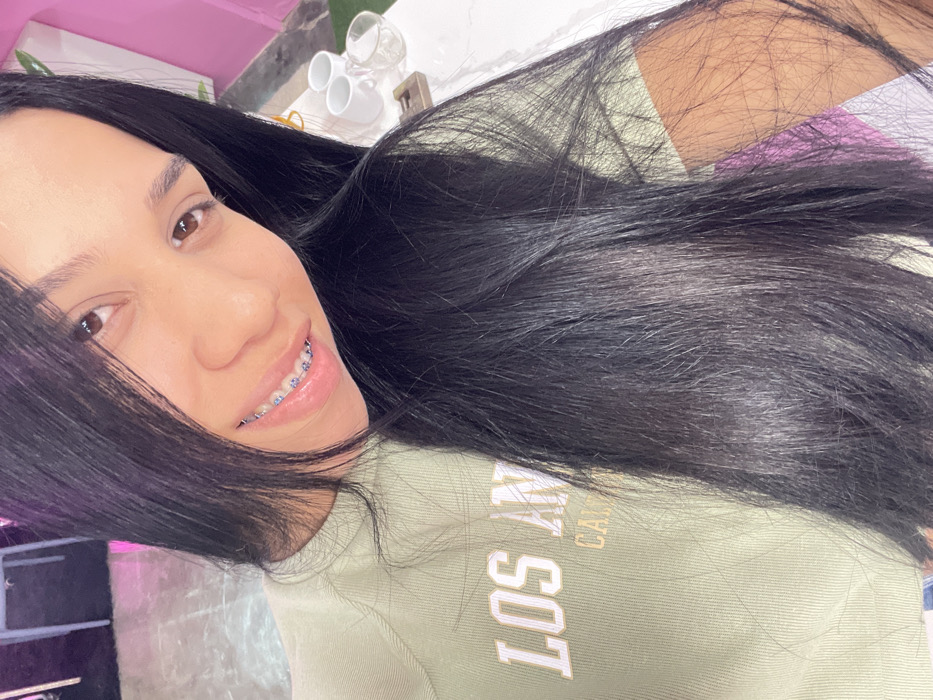 The image displays a close-up portrait of a female individual, located in Altagracia, Venezuela. She has long, straight, dark hair that cascades over her shoulders and upper torso. Her face is turned slightly towards the camera, and she is smiling, revealing dental braces with light blue or purple elastic bands on her upper teeth. Her eyes are brown, and her complexion is olive. She is wearing a light olive-green long-sleeved shirt with the text "LOS ANGELES CALI" printed in white and light brown lettering on the chest. The background depicts an indoor environment: a white tabletop on the right holds two white ceramic mugs, a clear glass vessel, and a small dark rectangular object. Further right, a pink wall is visible above a section of green artificial turf on the floor. The upper left background shows blurred metallic elements, likely furniture, illuminated by a pink/purple light source reflected on a light-toned floor.