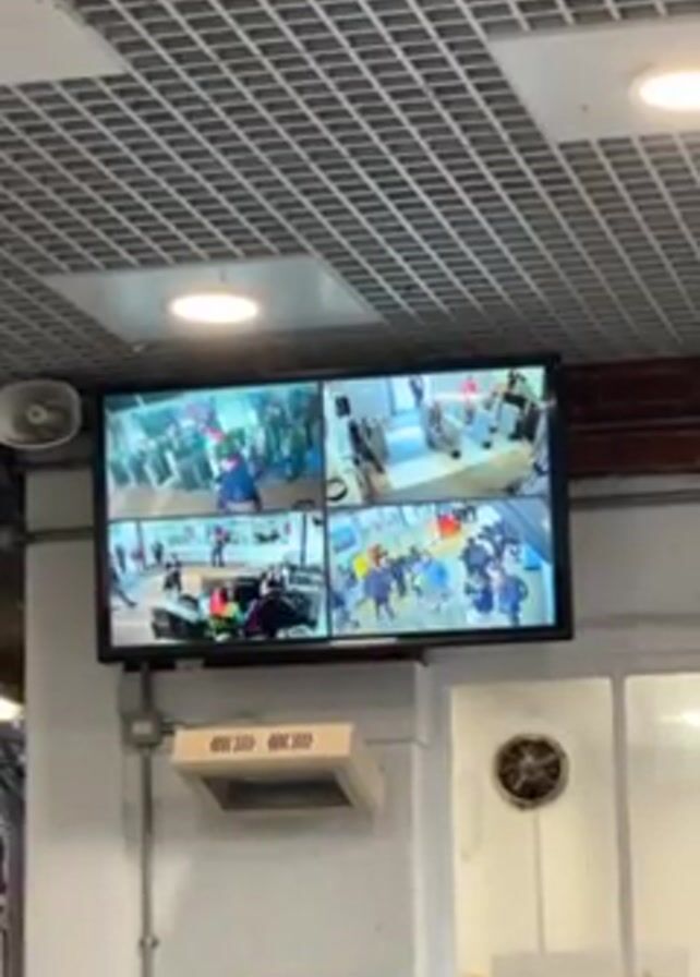security monitor displaying footage from four different cameras. The monitors appear to be showing the entrance or exit of a building or facility with people walking through turnstiles. There is a sign indicating secure parking. The monitor is attached to the wall. The ceiling is covered in a white grid.