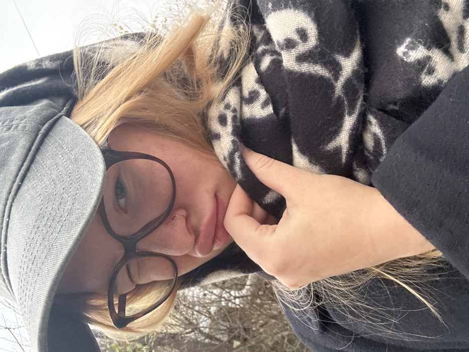 A head-and-shoulders outdoor portrait depicts an individual in Dnipro, Ukraine. The subject, appearing female, is centrally framed, looking directly at the camera. They wear a grey baseball cap, large dark-rimmed glasses, and a small ring piercing in the left nostril. The left eye is partially closed in a wink, and the lips are pursed forward. Light blonde hair is visible beneath the cap. The individual is dressed in a dark-colored coat and a black and off-white patterned scarf, which is held by the right hand near the chin. The background is out of focus, revealing bare tree branches consistent with an outdoor, possibly cold-weather, setting under an overcast sky.