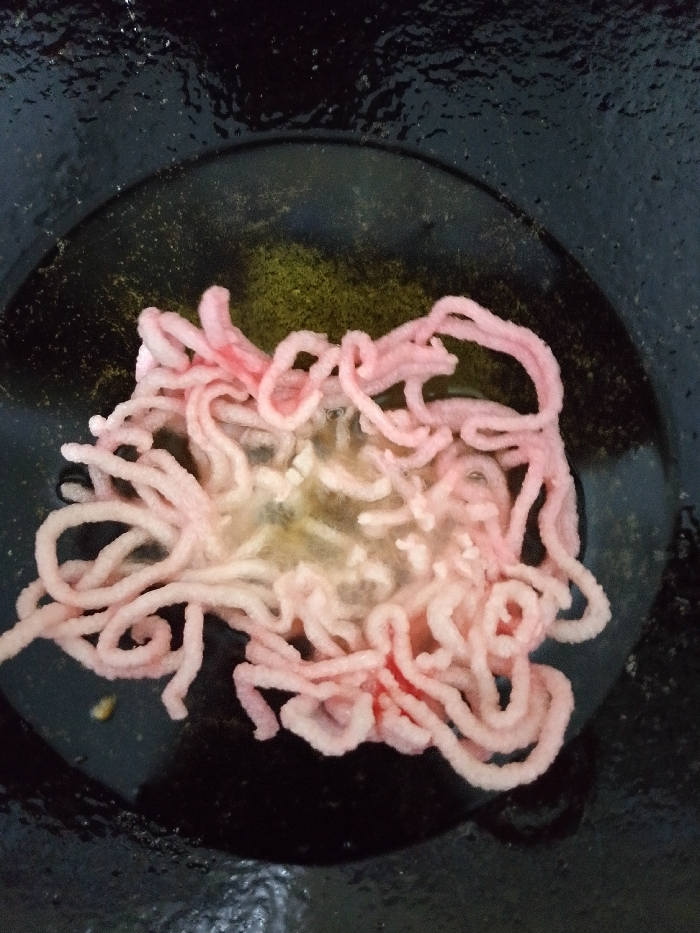 A close-up, overhead view depicts a dark, round cooking vessel containing golden-yellow cooking oil. Centrally located within the oil is a mass of pale pink, irregularly shaped, coiled or strand-like food items. The oil around and beneath these items exhibits active bubbling and frothing, indicative of high heat and an ongoing frying process. Some of the food items display slightly more reddish areas where they are denser or overlapping. This cooking scene is occurring in Gadingrejo, Indonesia.