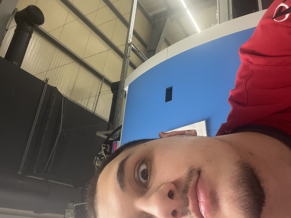 An upward-angled, close-up image depicts a male individual taking a selfie in what appears to be an industrial or manufacturing facility in Lyaskovets, Bulgaria. The subject, positioned in the foreground, is light-skinned with dark hair, dark eyes, a mustache, and a short beard. He wears a red shirt with a dark collar and a partially visible white design on the right sleeve. His left eye is wide open, looking directly at the camera, while his lips are slightly pursed. In the mid-ground and background, a large piece of industrial machinery, predominantly blue with white curved sections, is visible. A small, dark rectangular opening is present on the blue surface of this machine. Above the machinery, industrial ceiling elements include off-white corrugated metal panels, exposed metal structural beams, utility conduits, and black fabric or tarp-like material hanging. A dark, circular vent or fan is situated on the ceiling towards the upper right. A digital display with red numbering is partially visible above the blue machine, suggesting operational equipment.