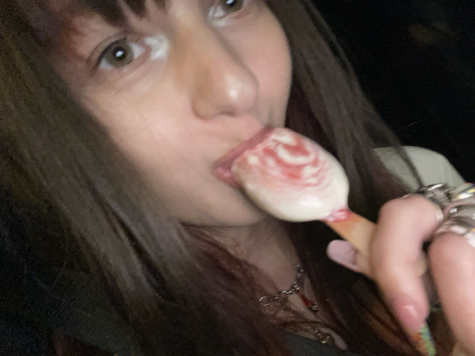 - "A woman with long brown hair and bangs is photographed up close while eating a swirl popsicle" by FM-AyUtz1, licensed under CC BY 4.0