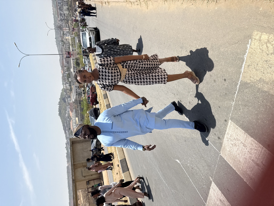 An adult male and female are depicted walking hand-in-hand on an asphalt road in Guzape, Nigeria, under direct sunlight