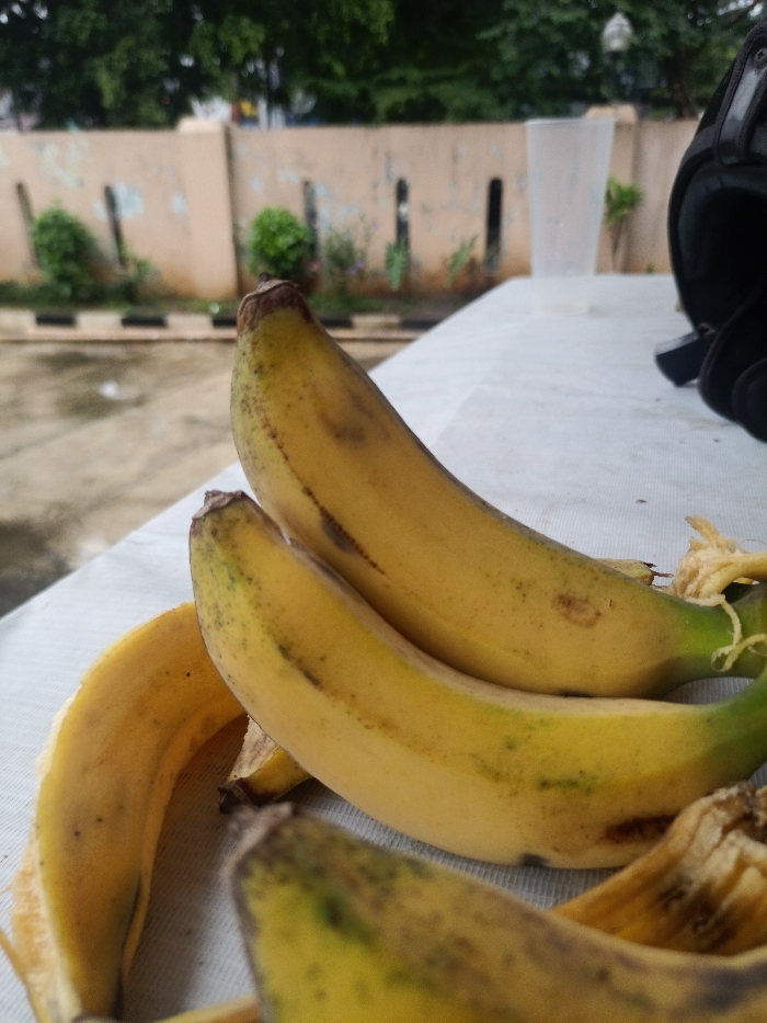 Several ripening bananas sit on a white, slightly textured surface. Two are unpeeled with green stems and scattered dark spots, while partially peeled banana skins lie nearby. A clear plastic cup stands in the background, along with a dark object resembling a helmet. The background features a beige wall with vertical indentations, greenery, and hints of a road or sidewalk.