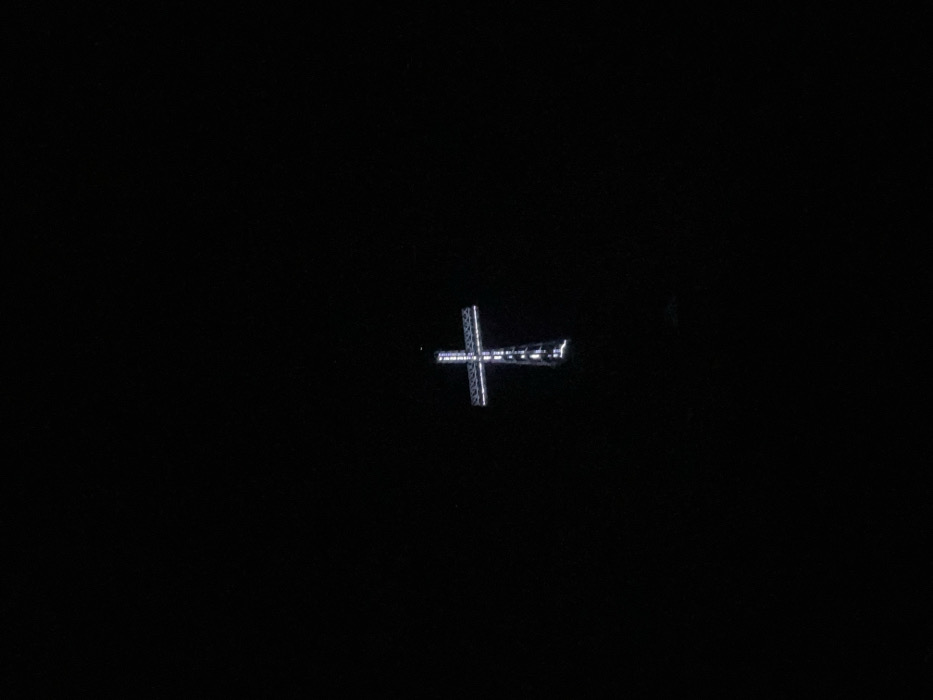 - "A large, brightly illuminated Latin cross structure stands prominently against a uniformly black background, indicative of nighttime conditions" by FM-nF1KG3, licensed under CC BY 4.0