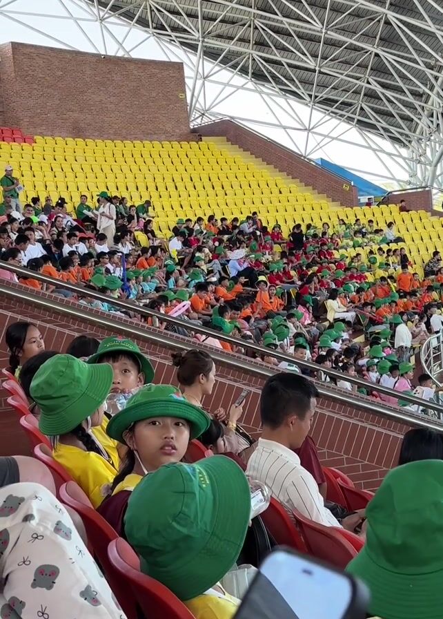 large group of people, primarily children, seated in the stands of a large stadium. The seating is tiered and primarily yellow in color, with some sections in red and blue. Many of the children are wearing brightly colored clothing, including green, orange, and yellow, and a large number are wearing matching green hats. There are also adults interspersed among the children. Some people are looking at their phones. A waterway is visible at the bottom right of the screen. The stadium has a large, modern roof structure made of white metal. Upbeat music plays in the background. The camera is held by someone seated in the lower section of the stands.