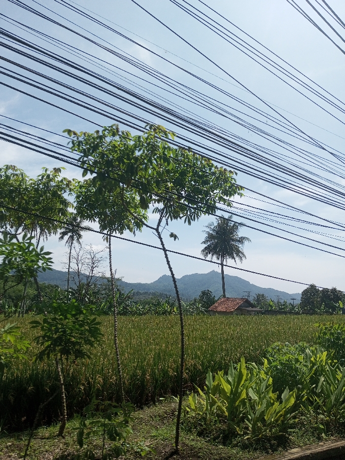 A landscape image depicts a rural scene under a clear, light blue sky with sparse white clouds, located in Beteng_Pangkhar_Somthrang, Bhutan. The upper half of the frame is dominated by multiple dark, parallel utility lines stretching horizontally across the sky. In the foreground and midground, various trees are visible, including several slender-trunked trees with dense green foliage and multiple tall palm trees with fronds at their tops. The midground features an expansive field of mature green crops, likely rice paddies, displaying a yellowish-green hue. Partially obscured within the greenery, a small building with a distinctive orange-red tiled roof is situated to the right of the center. In the distant background, a range of green, undulating mountains rises under the sky, while additional utility structures are faintly discernible. No people or overt actions are present in the scene. The lighting suggests a bright, sunny day.