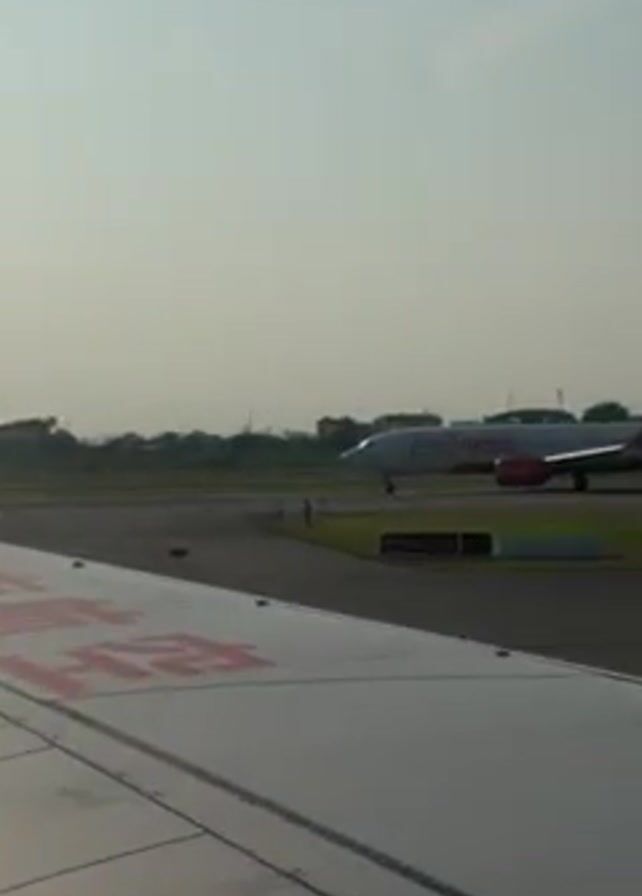 From the window seat of an airplane, we see the wing of the plane and another Air India Express plane taxiing on the runway