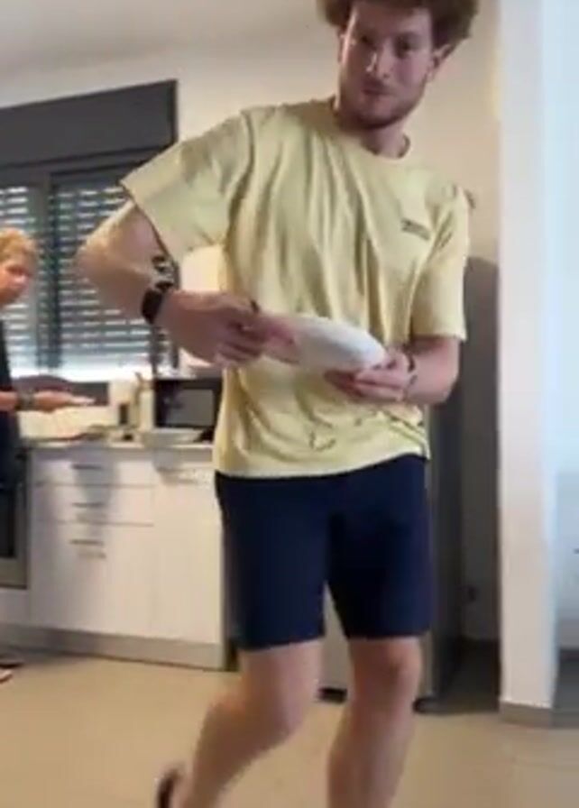 young man in a yellow t-shirt and dark shorts walking from the kitchen into a living room