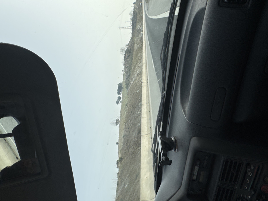 The image depicts a view from within a moving vehicle on a multi-lane highway located in Macedo de Cavaleiros, Portugal, under a clear, bright sky. The foreground shows the dark-colored dashboard of the vehicle, with a black suction-cup phone mount affixed centrally. Wiper blades rest at the base of the windshield. A light-colored sun visor is visible in the upper left, reflecting a partial view of what appears to be a human arm or shoulder. The road, composed of dark asphalt with white lane markings, curves to the right. A concrete barrier separates the highway from a gently sloping embankment on the left, which is covered with sparse, dry vegetation and scattered trees. In the distant background, a metallic power line tower is visible on the right horizon, with power lines extending across the sky. No other vehicles or individuals are explicitly visible.