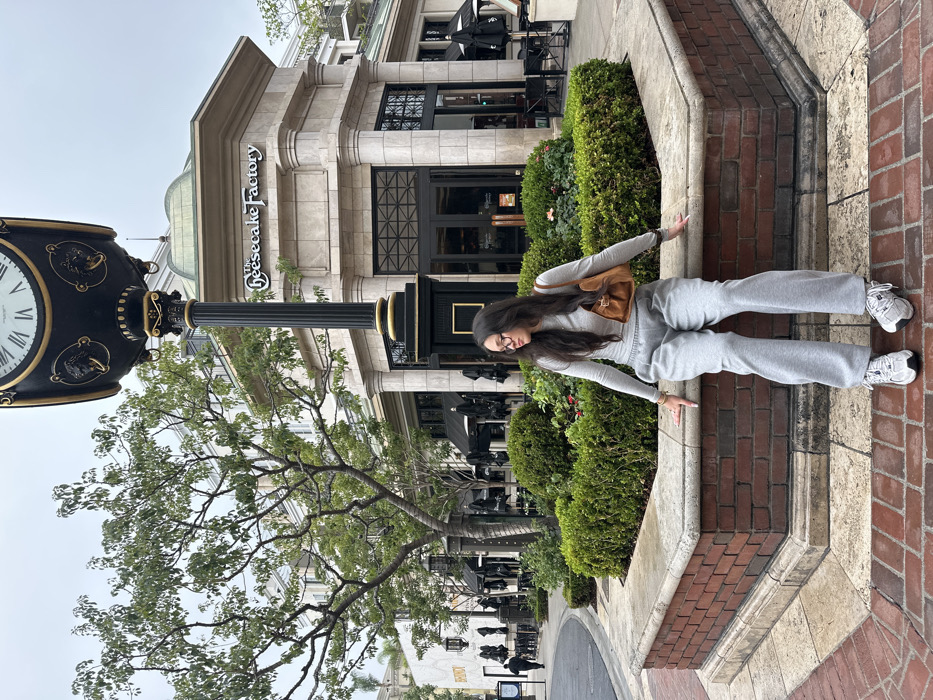 A female subject is positioned centrally, seated on a low planter composed of a red brick base and a light stone cap. She wears a light grey long-sleeve top, grey sweatpants, and white athletic shoes with dark accents. Her long dark hair frames a face with glasses, and she carries a small brown shoulder bag over her right side. Her hands rest on the planter's edge, and she looks to the right of the frame. Behind the subject stands a prominent black decorative street clock with gold embellishments and Roman numerals, displaying approximately 11:30. Directly behind the clock is a multi-story building identified by "The Cheesecake Factory" sign on its facade, constructed of light-colored stone with large windows and a dark entrance. This scene is located at The Americana at Brand in Glendale, California, United States. To the left of the clock and behind the subject, a tree with green foliage is visible. The immediate surroundings include additional manicured green bushes within the planter and other retail establishments with dark awnings and outdoor seating areas further down a curving street to the left. The ground is paved with red brick pavers. The sky is overcast. A solitary individual is faintly visible walking in the background to the far left.