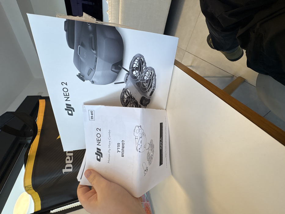 The image depicts an indoor scene, likely in Israel, as indicated by Hebrew text on a visible manual. A person's light-skinned right hand is holding a folded white paper user manual for "DJI NEO 2 Motion Fly More Combo," which also features Hebrew text "מדריך למשתמש" (User Manual) and "39-שח" (39 Israeli Shekels). An illustration of a drone and goggles is printed on the manual. Adjacent to the manual on a white table with a wooden edge, a partial white product box for "DJI NEO 2" displays an image of grey FPV goggles and a grey drone with propeller guards. In the upper left background, a black and yellow bag with the partial text "ben..." is visible. A light-colored sofa or furniture item is partially visible in the right background. Below the table, a person's lower right leg and foot, wearing dark pants and a light-colored shoe, are visible on a light-tiled floor. The specific location within Tel Aviv is not discernible from the visual evidence provided.