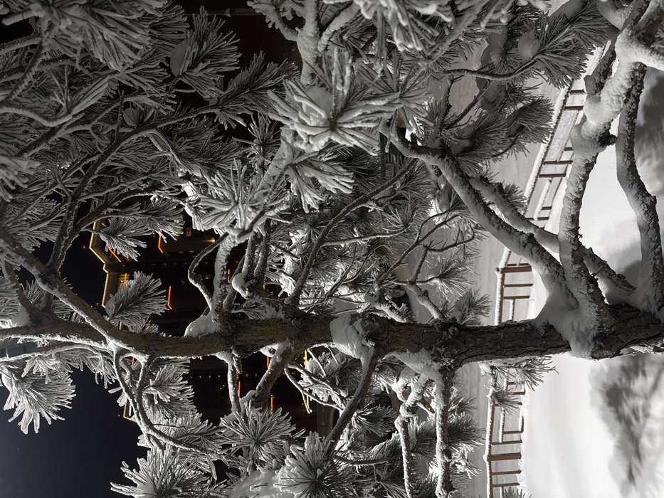 The scene depicts a nighttime winter landscape in Krasnoyarsk, Russia. A large coniferous tree, likely a pine, heavily coated in white snow and hoarfrost, dominates the foreground, with its trunk centrally positioned and snow-laden branches extending throughout the frame. In the mid-ground, a dark-colored railing, also covered in snow, curves across a uniformly snow-covered ground surface. The background features a tall, dark multi-story building against a black night sky. The building's upper facade or architectural elements are illuminated by distinct horizontal bands of warm orange light, consistent with the Hilton Garden Inn Krasnoyarsk located at Ulitsa Markovskogo, 81А. The environment is cold and snow-covered. No individuals or active subjects are present.
