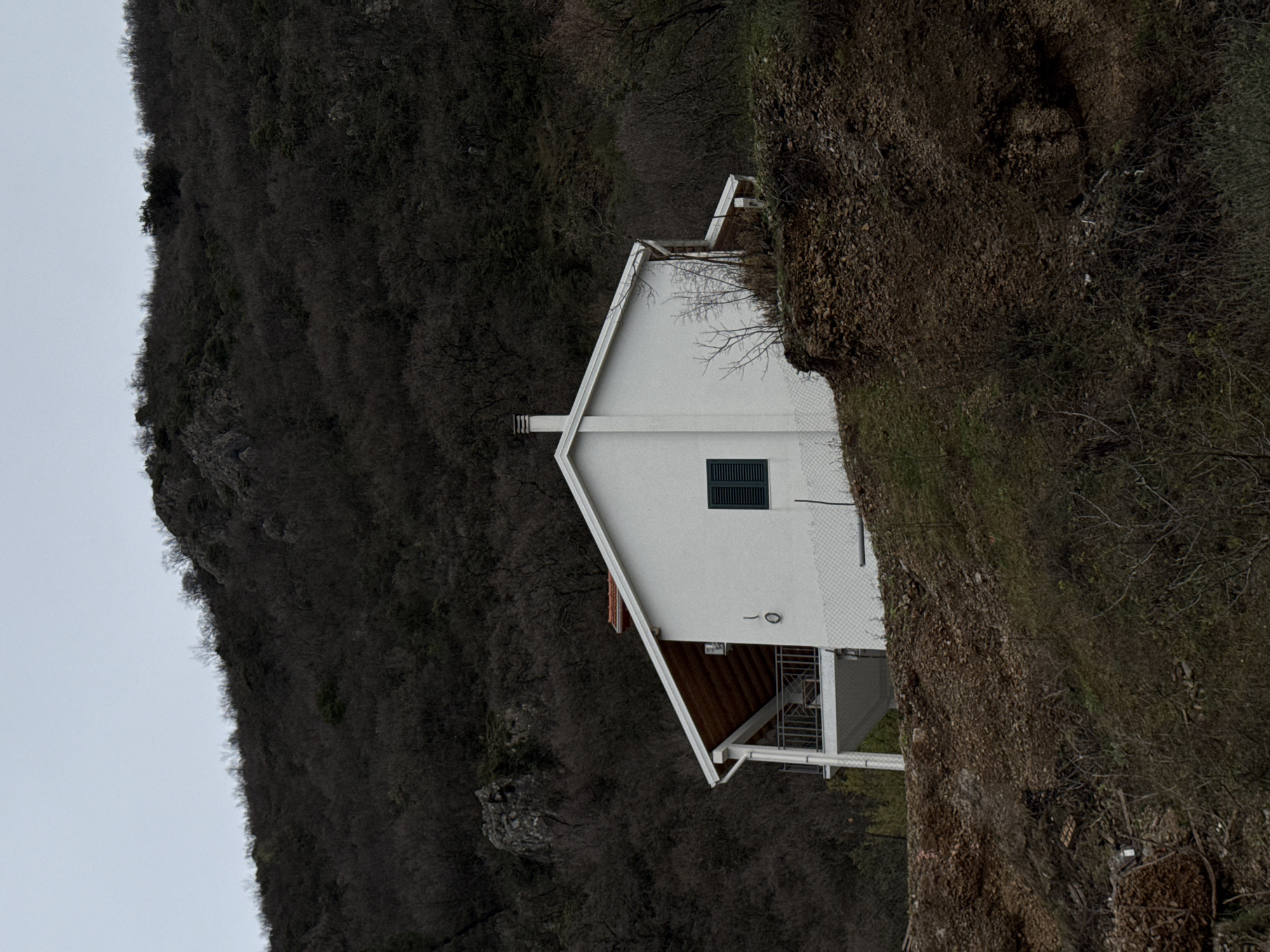 This image displays a detached, single-story residence with white exterior walls, situated on a terraced slope in Krapina, Montenegro. The structure features a pitched roof with a visible section of terracotta tiles under white guttering, surmounted by a white chimney stack on the right. The visible facade includes one rectangular window fitted with closed, dark green louvered shutters and a black vertical conduit. An open balcony, supported by white pillars and featuring a white metal railing, extends from the left side, revealing a wooden underside. The numeral "10" is painted vertically in black on the wall adjacent to the balcony. A low white fence marks the property line. The immediate terrain surrounding the house comprises a steep incline of brown, disturbed earth, loose rocks, and sparse, dry brush. The background is dominated by a dark, heavily forested mountain with predominantly leafless deciduous trees and exposed rock formations, all under an overcast, light gray sky. No human presence or activity is observed within the scene.