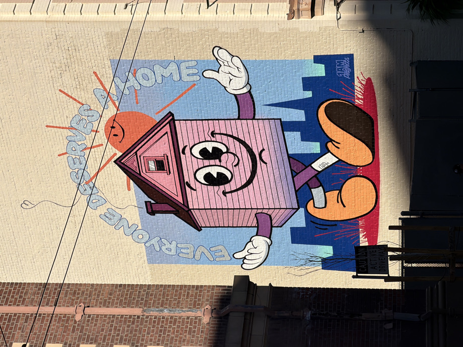 A vibrant mural depicts a cartoon house with eyes, a smile, and limbs, gesturing with gloved hands