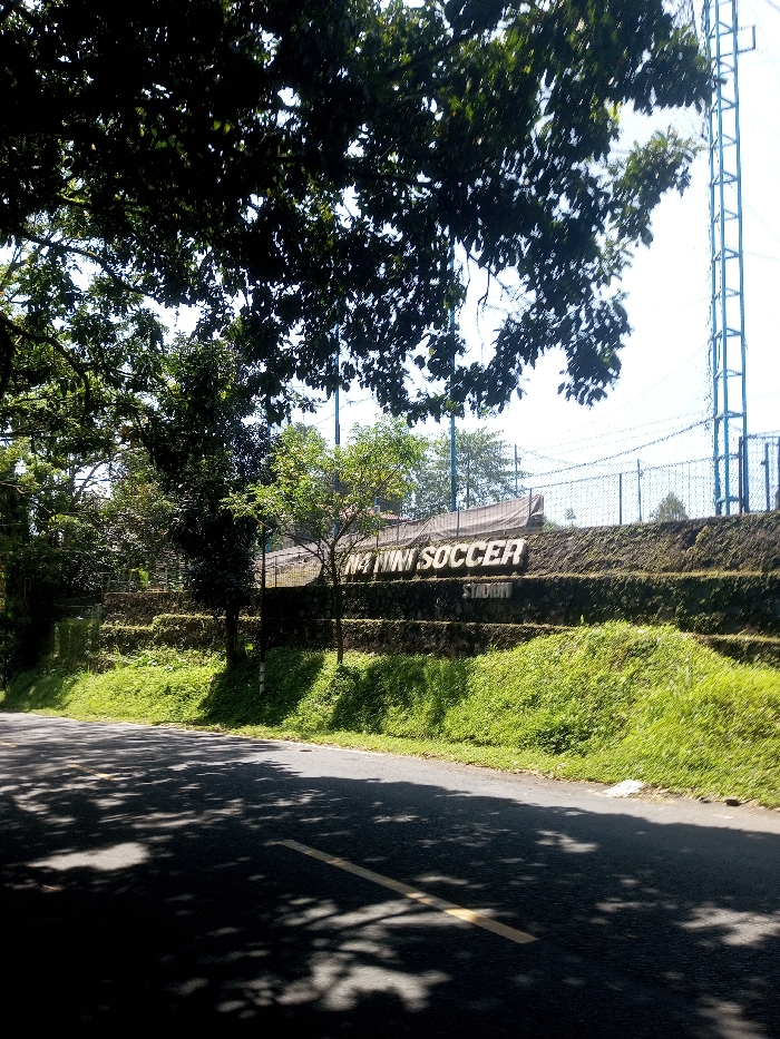 The image displays an outdoor scene in Beteng_Pangkhar_Somthrang, Bhutan, under bright daylight conditions. The foreground features a paved asphalt road, partially shaded by the dense canopy of trees positioned to the left and overhead. A single yellow painted line segment is visible on the road surface. To the right of the road, an elevated terrain rises, supported by a series of terraced retaining walls, primarily constructed from stone or concrete and covered with green vegetation. Affixed to one of these retaining walls, in large, white, three-dimensional lettering, is the text "NA MINI SOCCER STADIUM." Above the retaining walls and partially obscured by trees, a wire or chain-link fence encloses the area of the stadium. On the far right, a tall, light-colored metal structure, possibly a floodlight tower or support for netting, extends vertically against a clear, bright sky. No people, vehicles, or active interactions are visible in the scene.