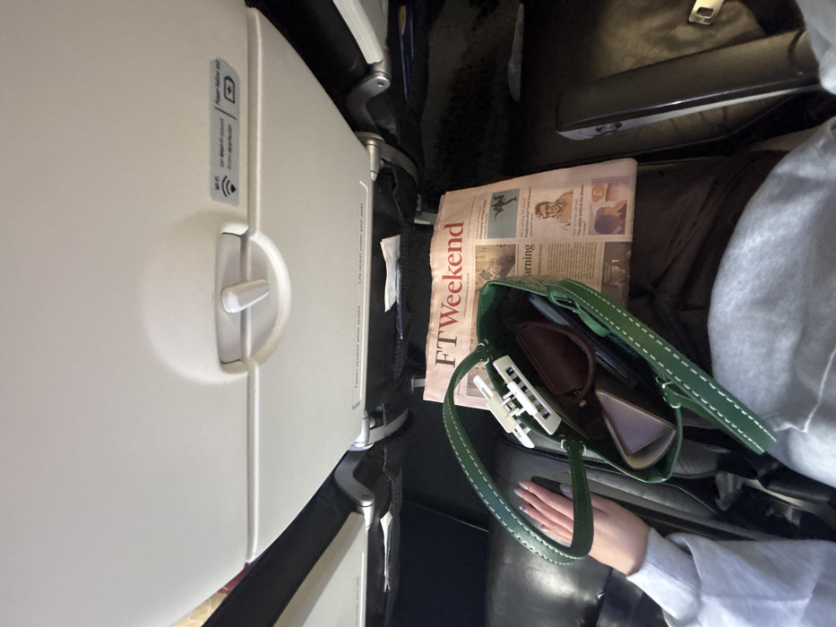 The image depicts the interior of a commercial airplane cabin, viewed from a seated passenger's first-person perspective. The scene is within an aircraft associated with Gatwick Airport (LGW) in Crawley, United Kingdom. The overhead panel is white, featuring a central circular light/vent with a white toggle switch. To the right, symbols for Wi-Fi and power are visible, along with text indicating "Power below arm." Labels for "Fasten seatbelt while seated" and "Life jacket under your seat" are also present. Below the overhead panel, a black mesh seat pocket contains a white tissue. In the foreground, a person's lap is covered by a light grey garment. A copy of "FT Weekend" newspaper is laid flat on the lap. To the left of the newspaper, a dark green handbag with white contrast stitching is open, revealing its contents: two white hair claw clips, a dark brown coin purse, and a light brown triangular object resembling a sunglasses case. A person's left hand, adorned with light-colored fingernail polish, rests on the edge of the handbag. The arm is clad in a light grey long-sleeved top. Dark, possibly leather or synthetic, seating material is visible to the left and as an armrest to the right.