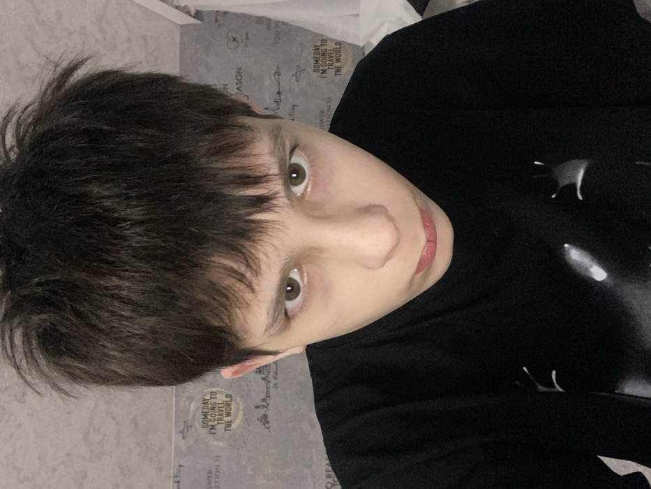 The scene is located in Andreyevo, Russia. A young individual with dark, slightly disheveled hair and brown eyes is centered, looking directly into the camera. The subject's upper torso is visible, wearing a black short-sleeved t-shirt featuring a subtle, light-toned graphic design on the chest. The individual exhibits a neutral expression with slightly downturned lips. The background consists of a light gray wallpaper patterned with faint text and schematic drawings. A discernible phrase on the wallpaper reads, "SOMEDAY I'M GOING TO TRAVEL THE WORLD," surrounded by imagery of city skylines, airplanes, and hearts. A white, undefined object, possibly part of furniture, is partially visible on the far right edge of the frame. The lighting is uniform, suggesting an indoor setting. No overt actions or interactions are depicted beyond the subject directly engaging the camera.