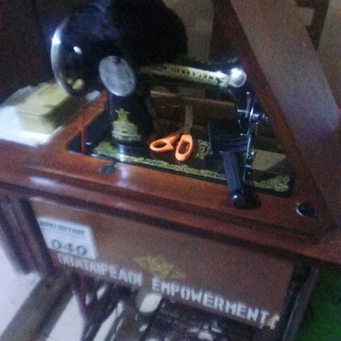 - "The image presents an indoor, eye-level view of a black, vintage-style sewing machine integrated into a dark brown wooden cabinet" by FM-qjhjS2, licensed under CC BY 4.0