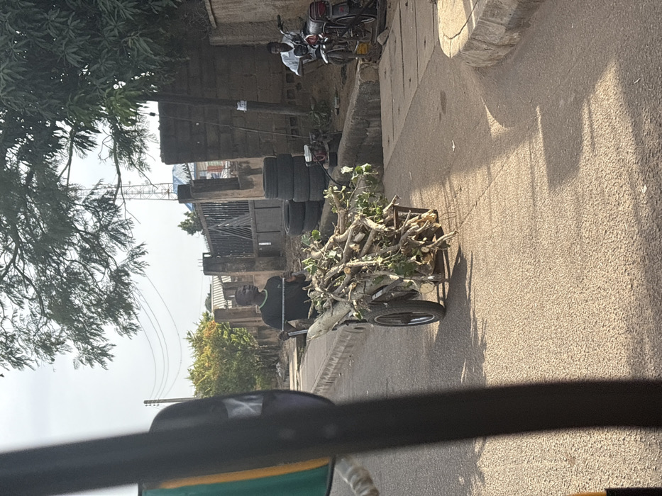 The image depicts a daytime street scene in Kabong, Nigeria, observed from inside a vehicle. In the midground, a dark-skinned male wearing a dark t-shirt and dark pants pushes a two-wheeled cart laden with cut tree branches and green foliage across an asphalt road. He looks to his left. Strong shadows are cast on the road, indicating direct sunlight. To the right, another dark-skinned male, dressed in a white t-shirt and light pants, sits on a parked black motorcycle next to a dirt shoulder. Behind him, a stack of four black vehicle tires rests against a concrete block wall. A utility pole stands adjacent to the wall, beneath a large tree with green leaves. In the background, a metal gate, various buildings, and a communication tower are visible under a bright, hazy sky. To the left, a concrete curb and drainage channel separate the road from additional foliage and structures further back.