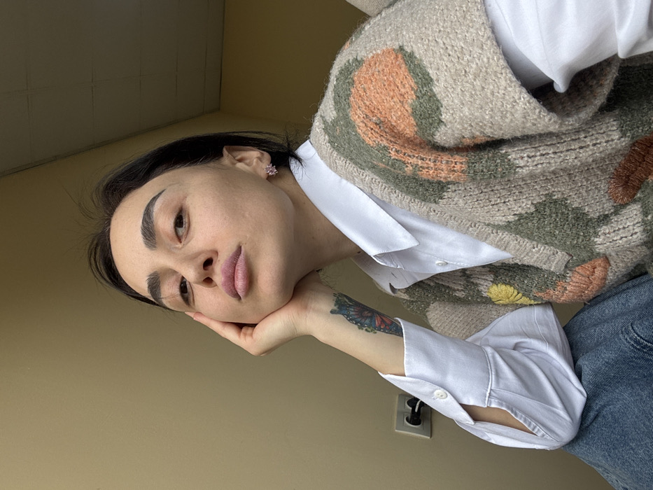 A female subject with dark hair and prominent eyebrows is depicted in a close-up, waist-up indoor shot. She is posed with her right hand supporting her jawline and cheek, looking directly at the camera. She wears a white collared long-sleeved shirt underneath a V-neck knit vest with a beige base and abstract patterns in olive green, orange, and yellow hues. Blue denim jeans are partially visible in the lower left. A colorful butterfly tattoo is visible on her right forearm, and a small pink flower-shaped stud earring is present in her right ear. The background consists of a plain light beige wall. On the lower left of the wall, a white electrical outlet is visible with a black cable plugged into its upper socket. The ceiling, visible in the upper right, appears to be a light-colored panel or textured surface. The specific location within Tbilisi, Georgia, cannot be determined from the visual information provided.