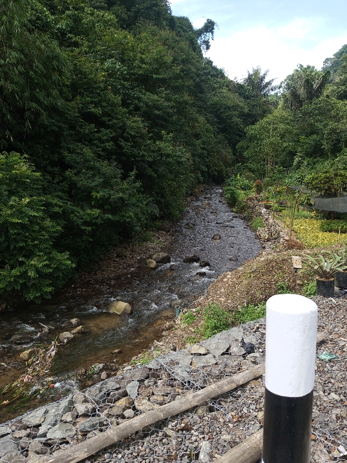 This image displays a natural stream flowing through a densely vegetated valley in Ariyalai, Sri Lanka. The stream occupies the central and left portions of the frame, moving from the background toward the foreground. Its bed is composed of numerous visible rocks and boulders, with clear water exhibiting ripples and localized turbulence. Both banks are heavily covered with lush green foliage; the left bank features dense, tall trees and undergrowth extending up a hillside, while the right bank, closer to the foreground, shows a more managed appearance. Along the immediate right bank, a retaining structure of rocks enclosed by wire mesh (gabion baskets) is visible. Two unworked wooden logs lie horizontally across the top of this gabion structure. Further back on the right bank, several small plants are visible, some contained within black pots. A prominent cylindrical bollard, painted white on its upper half and black on its lower half, stands in the lower right foreground, partially obscuring the gabion wall. The sky, partly cloudy, is visible at the top of the image. No individuals are present.