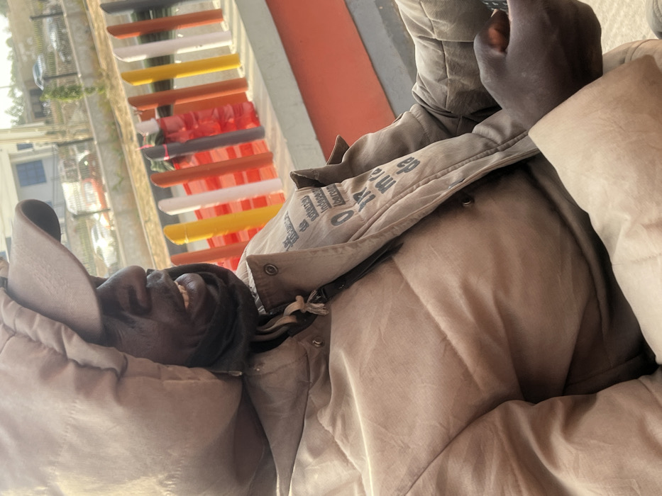 A man wearing a beige puffer jacket is lying down, smiling with his mouth open. He has dark skin and is wearing a hood. The jacket has a high collar and some writing on the shoulder area. Above him are colorful horizontal lines of red, orange, yellow, white, and black. A building is visible in the background. The overall composition is at a tilted angle.